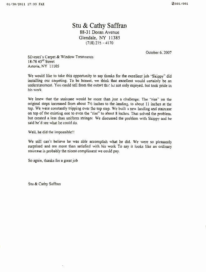 Dear Joe: We can't thank you enough for everything you did for us. Everything from pricing, product quality, workmanship, professionalism, and above all courtesy and care from all involved. Sal, hector, Juan, and of course you, are the best!! The floor is absolutely beautiful and we absolutely love it!! Hector did a superb job. Also thank you for referring John Narciso. He and his workers did an outstanding job as well. We will be calling on you and John for future work we need done. My best regards to Dawn, Joseph, John Paul and Maria. God Bless--- With much appreciation, Ralph & Anna Villa